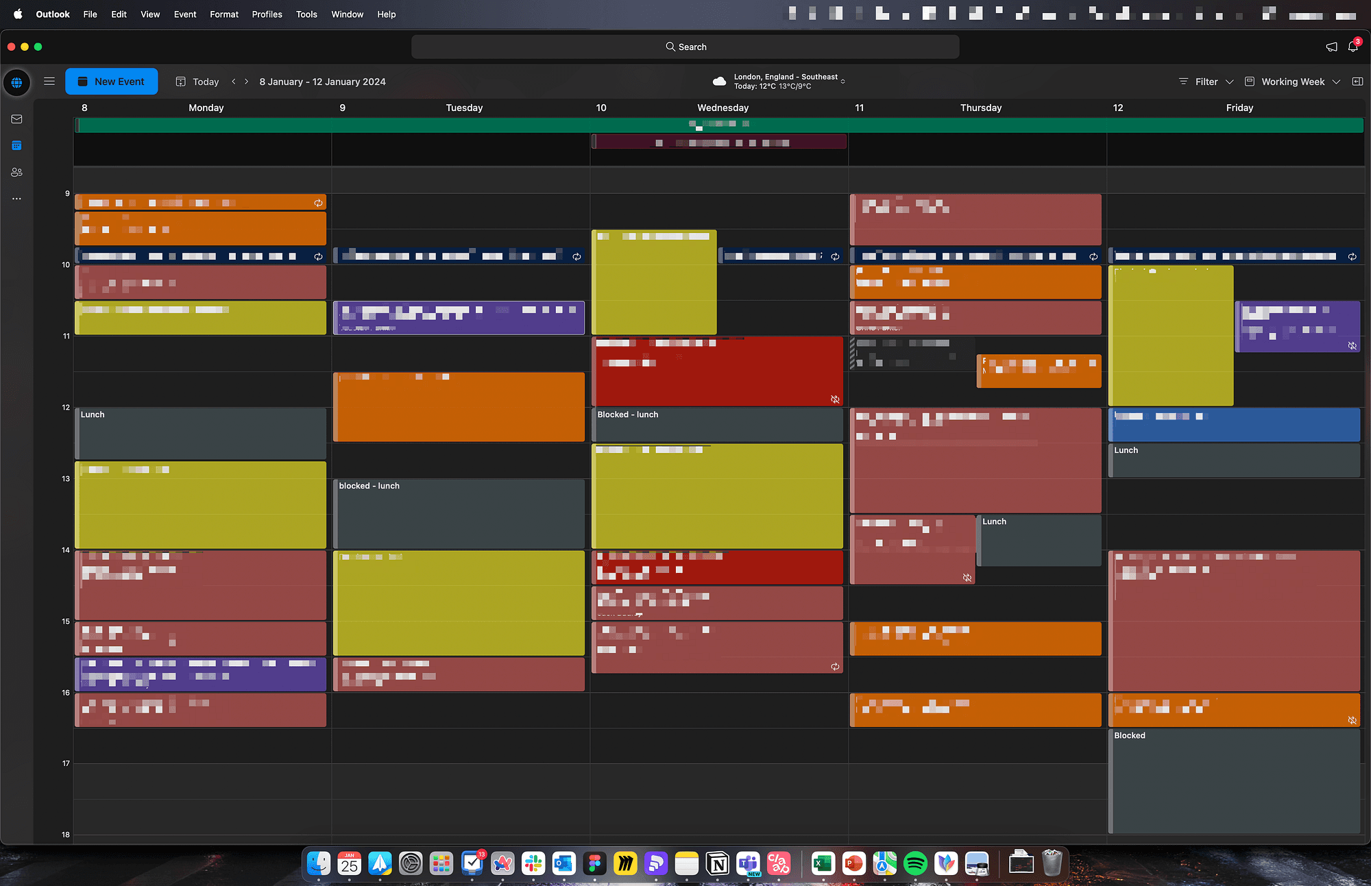 And finally, dark green, working elsewhere. Every time I go to the office, I mark it in my calendar and highlight which office. I often share that event with others to let them know where I’m going to be that day, so they can plan accordingly and meet me in the office. There is no point in going to the office to sit on your own on Zoom calls all day.